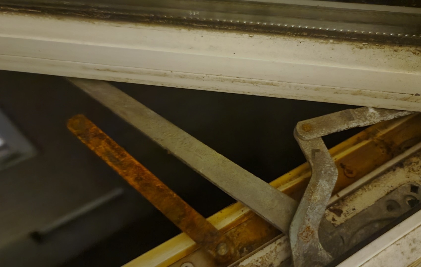 Window opens with difficulties due to rusty levers. Window is located on second floor and may require a.long ladder